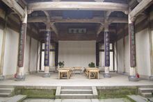 前廳是整幢房子中最精華的部分,大門后面聳立著一幅威儀的中門,在中門“!弊值纳戏剑傆幸环镜瘛鞍僮郁[元宵”圖,圖上雕刻著100個(gè)小男孩過元宵鬧花燈時(shí)的情景,這正是古代“多子多福”傳統(tǒng)觀念的生動(dòng)寫照,“百子鬧元宵”圖兩邊的“商”字斗拱上則分別雕有四出《三國演義》的戲文,斗拱的上方雕有“南、北”財(cái)神,“南、北”財(cái)神的上方是閣樓護(hù)板,在此,汪定貴設(shè)計(jì)了“漁、樵、耕、讀”四根木雕立柱,分別代表了古代的四種職業(yè)。