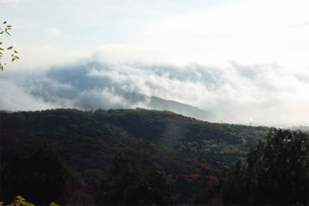 仲夏清晨,雨后天氣濕潤時,常可見如素如練的云霧飄浮于三山之腰,似斷還連的畫中之境。注目靜觀,或自峰后繞于嶺前,或從石隙游出升騰;有時凝固不甚流動,有時行走又很疾速。翠微山、虎頭峰間凝然不動者居多,盧師山青石黛樹中則流走如飛者眾。概山勢高低不同所致。