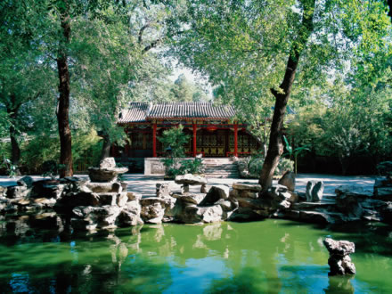 西路的方塘,面積約有2000平方米,是王府花園里最大的水域。有亭翼然立于湖心之中,雕梁畫棟,滿繪彩畫,船型的木橋與岸邊相接。粉色的荷花亭亭玉立,與大如華蓋的翠綠的荷葉交相輝映。戲水的白鵝,時時躍出水面的金魚,打破了水面的平靜。此情此景,令人恍若置身于仙境之中。