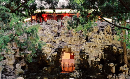 安善堂”北有一座假山,名叫滴翠巖。藏有康熙福字碑的秘云洞,就位于“滴翠巖”中心腹部。假山頂是整個花園的制高點(diǎn),頂上的建筑叫“綠天小隱”;建筑前面的平臺為“邀月臺”,是賞月的地方。