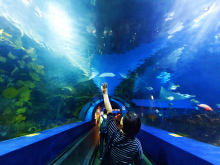 有金色的陽光、白色的沙灘、棲息在淺水海域的潮間生物。模擬生機(jī)勃勃的仿真海岸線長(zhǎng)達(dá)48米,游客傾聽著輕柔的海浪,可以親手觸摸形態(tài)各異的海洋軟體動(dòng)物;孩子們?nèi)脒M(jìn)觸摸池中,能體驗(yàn)海水的感覺和與大海龜嬉戲的樂趣。