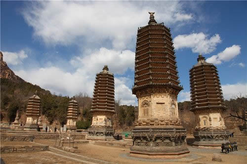 銀山塔林位于銀山南麓,現(xiàn)存17座墓塔,大小高矮不等,高者20余米,直徑達7米左右,矮者只有兩三米高。從塔的形制上看,大體上可分為兩大類:一為密檐式塔,二是覆缽式塔。這里保存的幾座大型墓塔全部是密檐式結(jié)構(gòu),是北京地區(qū)保存最好、最為集中的密檐式塔群。有六角形和八角形兩種,都是仿木結(jié)構(gòu)的密檐式磚塔。塔身自下而上逐層遞減,塔的高度不等,最高的佛覺禪師塔高22.8米。造型最為精美的是懿行大師塔,是典型的金代作品。塔高18米,平面為八角形,塔基由須彌座和斗拱勾欄平座組成,須彌座雕有獅頭寶瓶等紋飾,整個塔基除斗拱外,滿布花紋,雕刻繁縟,頗具匠心。仰蓮之上為塔身,塔身八隅旋圓柱,頂端砌以闌額普相枋,檐下每間補間旋施斗拱一朵,單抄四輔作。塔身四面辟假門,其余四面辟方形假窗。塔共拔檐13層,每層用疊澀手法向外砌出五層,代替檐椽,逐層收減,呈現(xiàn)出豐滿有力的卷殺。