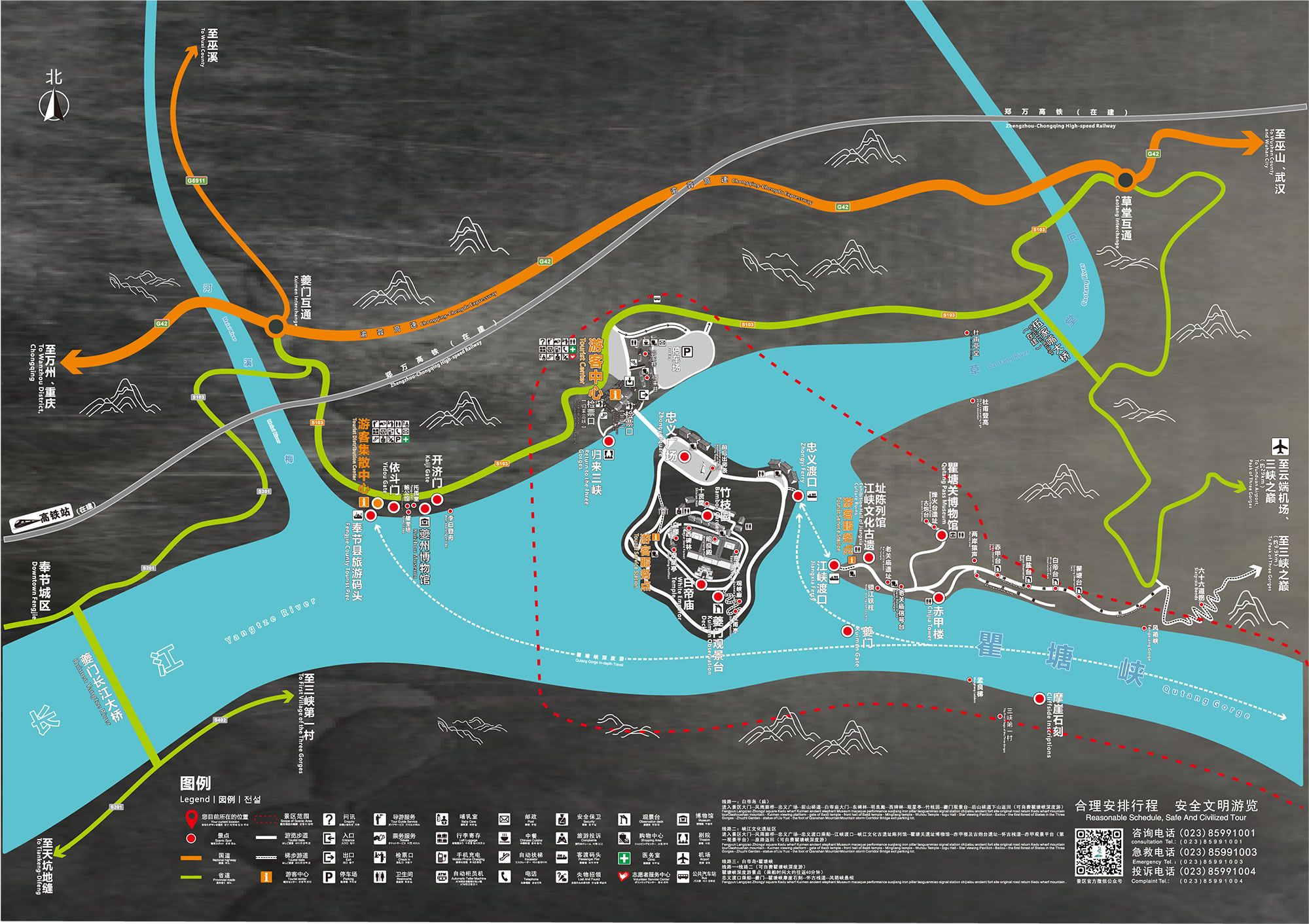 白帝城·瞿塘峽景區(qū)總面積4.7平方千米,主要由白帝城、瞿塘峽兩大景區(qū)構(gòu)成,名勝古跡眾多,融自然與人文、詩情與戰(zhàn)火為一體,是飽覽長江三峽壯麗之美的起點。白帝城擁有多座城門,發(fā)現(xiàn)的有東門、小北門、大北門、皇殿臺甕城門(桑閤門)、小西門、西門等,白帝廟內(nèi)有明良殿、武侯祠、觀星亭等明清建筑。 瞿塘峽緊鄰白帝城,全長8千米,集雄、奇、險、峻為一體,是三峽中最短、最窄、最險的一段峽谷。瞿塘峽內(nèi)北岸赤甲山上有老關(guān)廟文化遺址、大溪文化遺址、巫山猿人遺址三大遺址和老關(guān)廟信號臺、赤甲樓、古炮臺、古棧道、風(fēng)箱峽懸棺等景點;南岸白鹽山有孟良梯古棧道遺跡、摩崖石刻、犀牛望月峰、猿人峰等景觀,濃縮了中國200萬年的人類發(fā)展史。