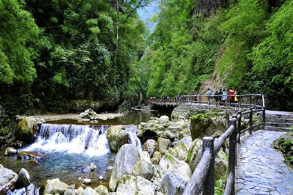 錦雞峽是黑山谷第一個(gè)峽谷,峽谷呈“V”型,全長(zhǎng)360米,垂直高度近500米。兩側(cè)巖壁層層疊疊,山勢(shì)雄奇險(xiǎn)峻,水流奔騰湍急,夾岸峰插云天。在峽谷內(nèi)的竹灌叢中常有中國(guó)特有鳥種(也是觀賞鳥)紅腹錦雞出沒。