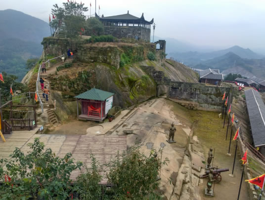 滑石寨位于金帶鎮(zhèn)滑石村3組,是平壩上突兀拔起的一座高260多米的孤峰。孤峰呈紡錘形,四周皆是懸崖峭壁,峰頂平地有6000平方米左右。峰西是一堵傾斜約75度、近10萬(wàn)平方米的完整石壁,石壁上鑿有一條寬不盈尺的之字形石階,它是通達(dá)寨上的惟一路徑。從山下到寨上要走1個(gè)多小時(shí)路程,其中要經(jīng)過(guò)2000多級(jí)在石壁上開(kāi)鑿的石階,山腰到山頂分別有兩道寨門(mén)把守。記者在現(xiàn)場(chǎng)看到,山腰一道寨門(mén)門(mén)楣上清晰刻寫(xiě)著“未雨,嘉慶二年十月立”字樣。登上寨頂,數(shù)十間木質(zhì)結(jié)構(gòu)的房瓦痕跡依稀可見(jiàn),青石砌的寨門(mén)和寨堡仍保存完好,四道墻體上都開(kāi)有射擊孔。整個(gè)寨堡耗石約1萬(wàn)多方,工程浩大,令人稱奇。