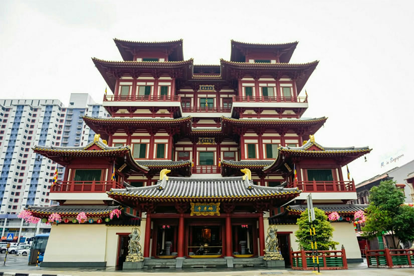 新加坡佛牙寺 新加坡佛牙寺坐落于牛車水碩莪街,樓高五層,全按中國唐代佛寺風格建筑而成。第一層是山門、鐘樓、鼓樓、觀音殿、百龍殿。第二層是阿蘭若藏經(jīng)閣及展覽廳、文殊殿,夾層樓是蓮芯茶坊、地藏殿、法堂、戒光堂、諸山長老德像紀念館。第三層是普賢殿、龍華院—佛教文物館。第四層是靈光殿、佛牙舍利金塔。第五層頂樓有萬佛閣、毗盧遮那大光明經(jīng)咒轉經(jīng)輪藏、萬福光明燈和胡姬花園。