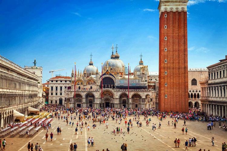 圣馬可廣場(chǎng) 圣馬可廣場(chǎng)(Piazza San Marco) ,官方標(biāo)準(zhǔn)譯名圣馬爾谷廣場(chǎng),又稱威尼斯中心廣場(chǎng),一直是威尼斯的政治、宗教和傳統(tǒng)節(jié)日的公共活動(dòng)中心。圣馬可廣場(chǎng)是由公爵府、圣馬可大教堂、圣馬可鐘樓、新、舊行政官邸大樓、連接兩大樓的拿破侖翼大樓、圣馬可大教堂的四角形鐘樓和圣馬可圖書館等建筑和威尼斯大運(yùn)河所圍成的長(zhǎng)方形廣場(chǎng),長(zhǎng)約170米,東邊寬約80米,西側(cè)寬約55米。廣場(chǎng)四周的建筑從中世紀(jì)到文藝復(fù)興時(shí)代都有。 圣馬可廣場(chǎng)初建于9世紀(jì),當(dāng)時(shí)只是圣馬可大教堂前的一座小廣場(chǎng)。馬可是圣經(jīng)中《馬可福音》的作者,威尼斯人將他奉為守護(hù)神。相傳828年兩個(gè)威尼斯商人從埃及亞歷山大將耶穌圣徒馬可的遺骨偷運(yùn)到威尼斯,并在同一年為圣馬可興建教堂,教堂內(nèi)有圣馬可的陵墓,大教堂以圣馬可的名字命名,大教堂前的廣場(chǎng)也因此得名“圣馬可廣場(chǎng)”。