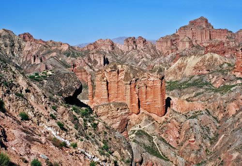 小西天景區(qū)位于冰溝景區(qū)的東部,主要景觀為一條滿布丹武地貌的山溝,均為長(zhǎng)約800米的山體游步道,游覽時(shí)間大約60分鐘。主要景點(diǎn)有神駝?dòng)e、紅層地貌、泥瀑布、泥鐘乳、泥葡萄、桃園結(jié)義(新娘出嫁、樓蘭商駝、千里相會(huì))、玄武門(龜蛇鎖江)、紅纓帽(裕固族帽子)、陰陽(yáng)柱(大地之根)、石雞(筆架峰)、七女峰(侍女拜佛)、僧人崖、金蟾拜佛、大佛石等,最有名氣的有神駝?dòng)e、桃園三結(jié)義、玄武門、蘑菇石、大地之根、七女峰、望夫石等景觀。