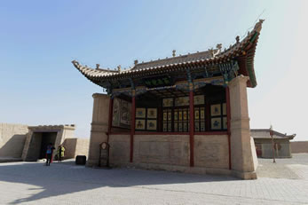嘉峪關(guān)戲臺(tái)是清乾隆五十七年(1792年)嘉峪關(guān)游擊將軍袋什衣主持修建,系當(dāng)時(shí)守城官兵、城內(nèi)居民及過往商旅的娛樂場(chǎng)所。其形制為典型的中國(guó)傳統(tǒng)古典戲臺(tái)。由木制屏風(fēng)把前后臺(tái)分隔開,屏風(fēng)正中央繪制八幅人物圖,是人們熟知的“八仙”內(nèi)容。頂部為中國(guó)傳統(tǒng)圖案“八卦圖”,“八卦圖”是中國(guó)古代思想文化與科學(xué)的綜合反映。兩側(cè)是一組風(fēng)情壁畫,內(nèi)容是寺廟的和尚、尼姑庵的尼姑及其豢養(yǎng)的寵物,這些繪畫內(nèi)容在其它戲臺(tái)上非常少見。戲臺(tái)兩側(cè)書寫有對(duì)聯(lián):“離合悲歡演往事,愚賢忠佞認(rèn)當(dāng)場(chǎng)”,概括了古往今來人間世事的演義變化及戲曲演出場(chǎng)所的功能作用。