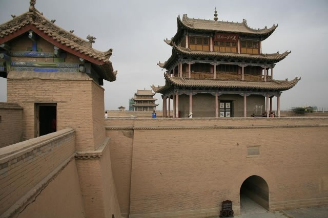 內(nèi)城四角有角樓,也叫“戍樓”,形如碉堡,是守城士兵值勤放哨的地方。南北城墻建有敵樓,是放置兵器的地方。站在這里回望,“光化樓”、“柔遠(yuǎn)樓”及“嘉峪關(guān)樓”三座高大建筑,同在一條中軸線上。這種“過洞式城門”及高臺(tái)樓閣建筑形式,是中國(guó)幾千年建筑歷史及建筑形式的延續(xù)發(fā)展。