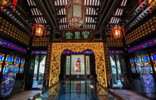 寶墨園的紫洞舫“泊”于清平湖岸邊。長21米,寬6.8米,高8.7米,共兩層。每層面積70米左右。主結構是鋼筋水泥,內外裝飾全是名貴柚木,由于造工精細,裝飾巧妙,就像全是木材造成的。全舫共有10個掛落,全是通花雕刻,其中有荔慶豐年、祥桃邀月、八仙賀壽、竹報平安、花開富貴、松鶴延年以及其它花鳥蟲魚。