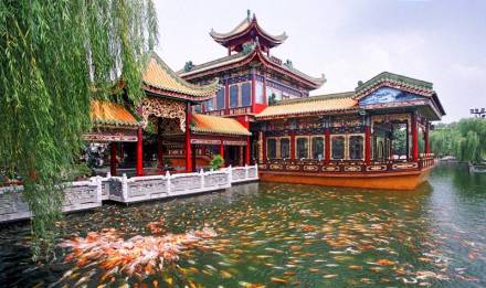 船頭上的大型木雕“百鳥朝鳳”更是栩栩如生,金碧輝煌。100只鳥兒,各具風姿,舫內擺設,全由花梨和酸枝木精工制成,宮廷式的幾椅,配以仿宋代器皿,豪華奪目。“九獅會金龍”大型屏風和《清明上河圖》精彩片段的雕刻,造工精湛,更稱精品。舫內一樓,是可容40人品茶聽曲的場所,以演奏廣東音樂和粵曲為主。