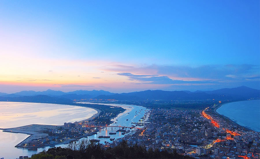 雙月灣位于惠東縣港口濱海旅游度假區(qū),地處惠東縣稔平半島的南端,三面環(huán)海,因形狀鳥瞰似兩輪新月,故名“雙月灣”。雙月灣共分兩灣,由大亞灣和虹海灣相鄰的兩個(gè)半月形組成。左灣水平如鏡,右灣波濤洶涌,兩條沙垅直奔大星山,如蛟龍出海,似雙龍戲珠,有靜有動(dòng),十分壯麗。