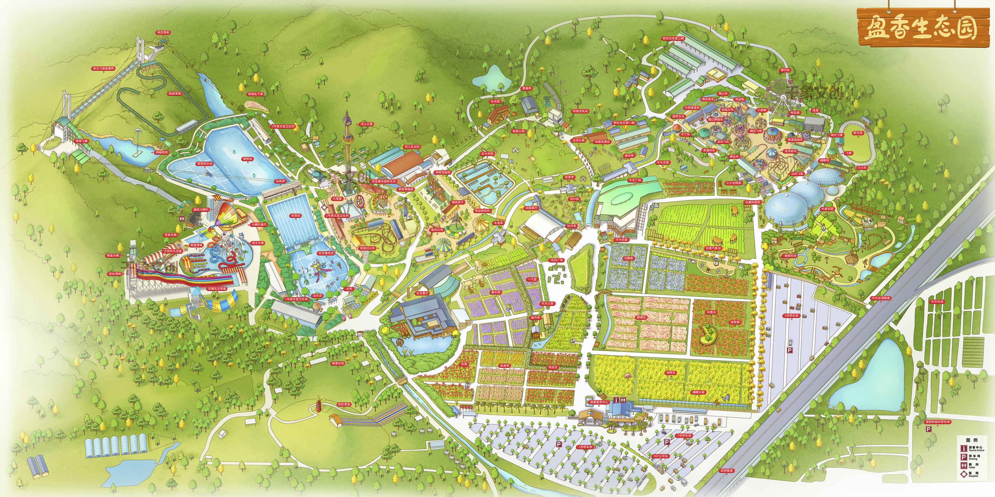 園內(nèi)設(shè)施主要包括有:凌云飛渡玻璃橋,水上樂園、百畝花海、科普王國、開心農(nóng)場、尖叫歡樂世界、開心牧場、抖樂園、彩虹滑道、野炊燒烤、手信店等。