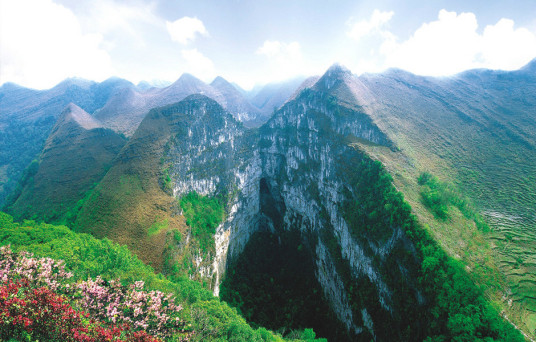 通靈大峽谷:位于靖西縣城東南部32公里的湖潤鎮(zhèn)新靈村,古龍山水源林自然保護(hù)區(qū)的南端,由念八峽、銅靈霞、古勞峽、新靈峽、新橋峽組成,總長10多公里。念八河從古龍山脈緩蜒而下,依次穿越五個(gè)峽谷,流入湖潤臺地。每個(gè)峽谷內(nèi)薈萃了舉世罕見的特高瀑布群、洞中瀑布、地下暗河、峽谷溪流、洞穴奇觀、古石壘、古懸葬、原始植被等自然景觀與人文景觀。