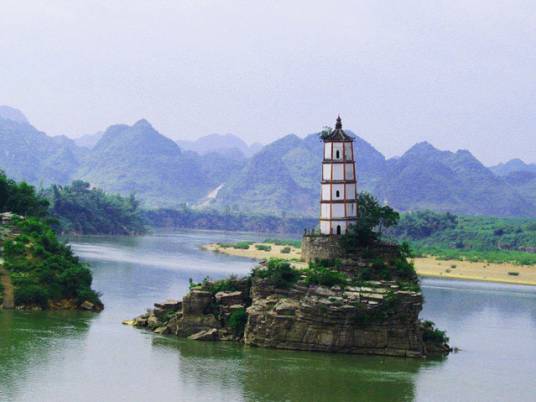 左江斜塔又名歸龍塔、水寶塔、歪塔,古稱鎮(zhèn)海寶塔,是世界八大斜塔之一,位于崇左縣城東北二千米處左江中的鱉頭山上。該塔建于明朝天啟元年(公元1621年),始建三層。清康熙三十五年(公元1696年)續(xù)建二層,為五層磚塔。塔底直徑5米,塔高18.28米,塔身呈八面體,塔頂置圓形鐵鍋一口。東西面砌磚數(shù)相差兩塊,故整座塔呈傾斜狀態(tài)。傾斜方向?yàn)槲髂掀?2°16′30″,傾斜度為4°24′64″,斜向與江水的流向正好相逆。