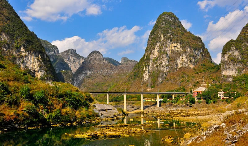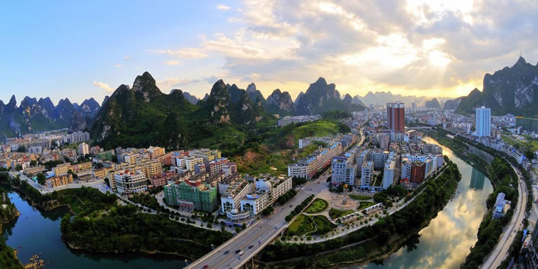 地理 金城江區(qū)系云貴高原余脈地帶,地勢(shì)自西北向東南傾斜,一般海拔為400-600米,最高海拔為1114米。屬桂西北邊陲要地,區(qū)境東界宜州市,西鄰東蘭縣,南接都安瑤族自治縣,北連南丹縣與環(huán)江毛南族自治縣。全境東西長(zhǎng)68千米,南北寬62千米,總面積2340平方千米, 耕地面積23.5萬畝。