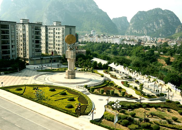 地形 金城江區(qū)系云貴高原余脈地帶,地勢(shì)自西北向東南傾斜,一般海拔為400-600米,最高海拔為1114米。屬桂西北邊陲要地,全境東西長(zhǎng)68千米,南北寬62千米,總面積2340平方千米,耕地面積23.5萬畝。
