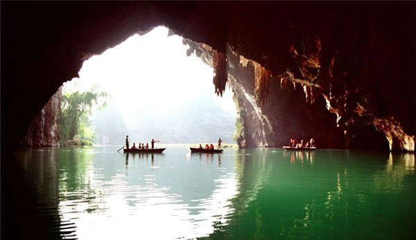 百鳥巖位于甲篆鄉(xiāng)烈屯西北面的漠齋山下,別名龍虎洞。因洞內燕子棲集,蝙蝠掠飛,又名百鳥洞。盤陽河自吉屯白熊洞潛入山下,形成1000多米的伏流暗河后,在此洞流出。洞口寬50米,一石壁把洞口分成兩個略呈三角形的左右洞口。左側洞口寬40米,高15米,兩洞口內側相通。洞深500米,蜿蜒曲折,直通與白熊洞一山之隔的拉類坳下的一個側洞口。洞中水平如鏡,深不可測,寬處約40米,窄處10米,從洞口行舟至300米轉折處,距水面30米處有一圓形天窗,山坳之光照到水面,猶如舞臺上的光束,色彩紛呈,近右側洞口處有沙灘,可?恐鄞。沙灘右側是一塊30多平方米的石臺,臺面深溝淺窩,坑坑坎坎,石臺一側,洞壁雪白,可攀援其中。有石鷹、石柱、石幔、石觀音菩薩等,百態(tài)千姿,令人目不暇接。石臺的周圍有仙女梳妝、海螺石,石螺對面有石桌、石缸和石松果等。側面洞口外香椿林下野花艷目植被繁衍,把洞口點綴得幽靜雅致。洞中歧洞叉水道不可勝數(shù),密如蜂房,不知所向,整個洞仿佛一座裝飾華麗、景幻莫測的水下龍宮。其奇特的景象似桂林蘆笛巖,又因非乘舟不能游覽,游人贈予“水上蘆笛巖”的美譽。