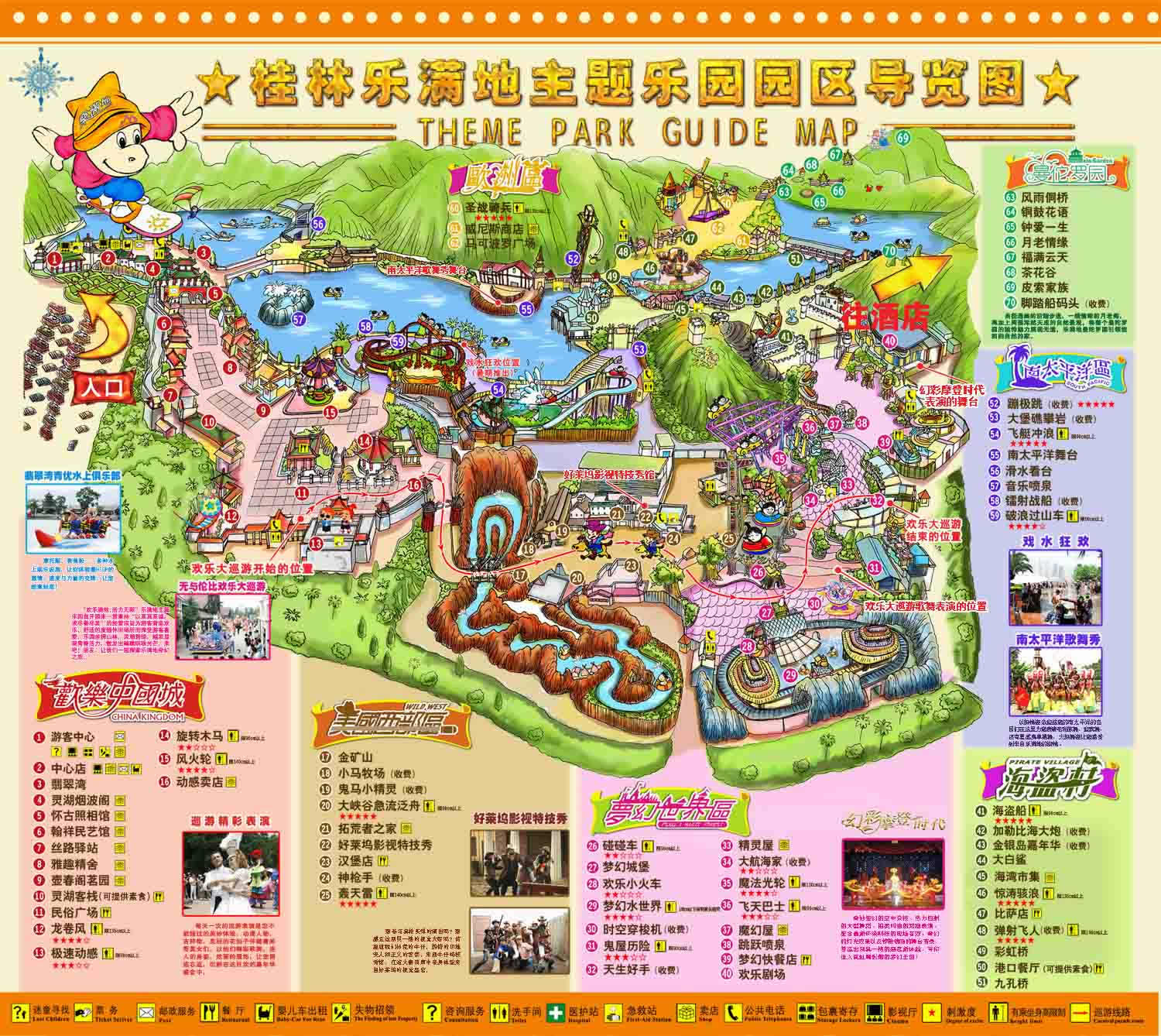 途中景點:正門 > 美國西部區(qū) > 夢幻世界區(qū) > 海盜村 > 南太平洋區(qū) > 歐洲區(qū) > 曼陀羅園
