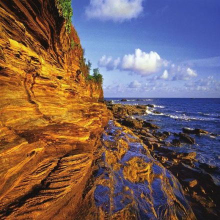 滴水丹屏原名滴水巖,位于潿洲島西部的滴水村,由巖石形成的懸崖峭壁是典型的海蝕地貌,裸露著的巖層,紅、黃、紫、綠、青五色相間,紋理十分清晰,崖頂之上藤樹纏繞,紅花綠葉倒掛崖頭,展現(xiàn)出旖旎多姿的色彩,故稱“丹屏”。巨崖巖層上長年涌動(dòng)著水珠,不斷地向崖下滴落,所以取名“滴水”。滴水丹屏的形成堪稱是中國火山景觀的奇跡。