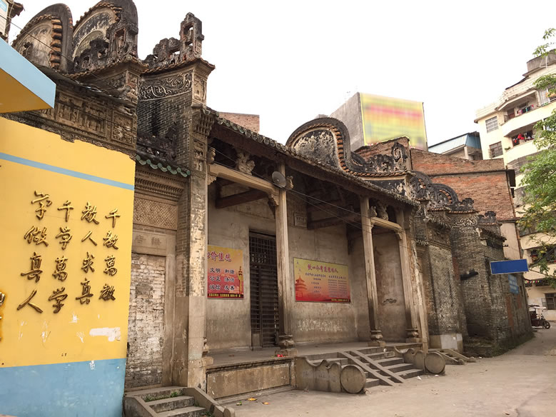 北流粵東會館位于今北流市城區(qū)永安路一里9號。始建于清乾隆二十年(1755年),建筑坐西向東,原規(guī)模為三進兩廂兩天井一戲臺,占地面積1400平方米,現僅存兩進一廂,占地面積642.6平方米。硬山頂磚木結構,鑊耳山墻,小青瓦屋面、青磚墻,抬梁穿斗式混合梁架。屋脊灰塑雙龍戲珠及博古紋,前座檐墻及廂房墻端堆砌陶瓷樓閣人物圖,檐廊柱間梁以石獅如意云柁墩作承重,三根枋墩雕刻人物及如意云紋,雀替透雕吉祥紋飾。中座內有4根花崗巖石柱支撐屋頂。庭院及通道均鋪設紅色階磚和花崗巖條石。