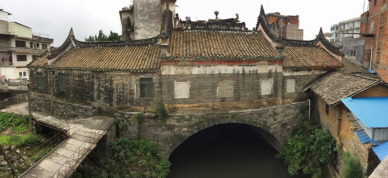 登龍橋在西河流向圭江的入口處。據資料記載,該橋始建于宋元年,全長36.3米,拱跨10米,高5.5米,寬13.5米。橋面一邊為橋的通道,中間建風雨亭,為歇山頂磚木結構;一邊建殿堂,青磚砌墻,青瓦覆蓋,硬山頂磚木結構。頂部磚砌灰雕花脊,兩端飾鰲魚,中間為火球。殿內墻端繪飾古壁畫,園木柱作頂柱。橋東牌坊上刻著“登龍橋”三個大字,整座建筑風格獨特,莊重樸實。為北流八景之“龍橋夜月”所在。