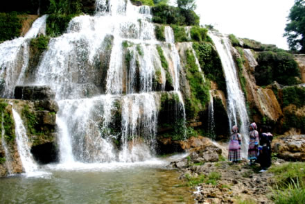 這里離米底河瀑布約一公里,突然泄入約500米的溶洞。經(jīng)過天生橋、天窗眼又流進(jìn)“摩天大樓”下變?yōu)榉,這里呈現(xiàn)的是只聞其聲、不見其影,然后從一線天大峽谷涌出,頗有亂石穿空,驚濤拍岸的雄奇氣勢。