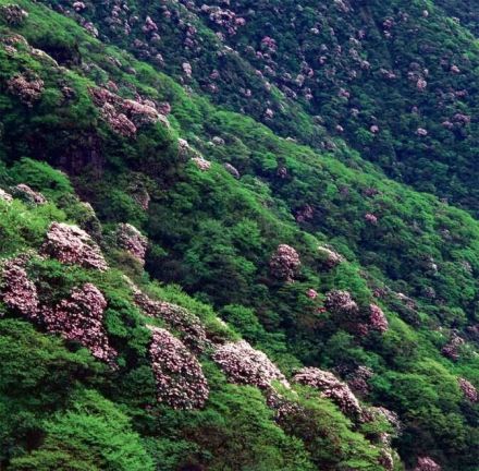 杜鵑花生長在高海拔、低緯度地區(qū),百里杜鵑林帶呈環(huán)狀分布,延綿50余公里,寬約1~5公里,總面積125.8平方公里,暮春三月,竟相怒放,繁花似錦。