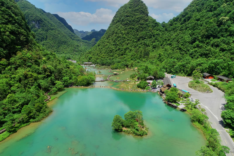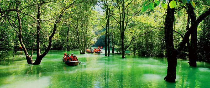 乘橡皮舟順?biāo)従彾,兩岸是蔥茸秀麗的喀斯特原始植被,幽靜的河水中,時(shí)而有魚兒躍起,時(shí)而有秀美島嶼出現(xiàn),宛如精巧的天然盆景。山水含情天做媒,帶著情侶竊竊私語(yǔ),帶著老伴同舟共濟(jì),帶著朋友戲水歡歌。