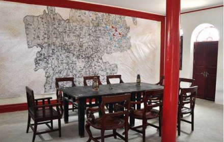 遵義會(huì)議會(huì)址是在二樓東側(cè)的長(zhǎng)方形,客廳面積27平方米,墻上掛著一臺(tái)時(shí)鐘,客廳中央有一褚色長(zhǎng)方桌,周圍有一圈木架藤條折疊靠背椅。西墻是一排玻璃窗,可見遠(yuǎn)處青山和臨街民房。