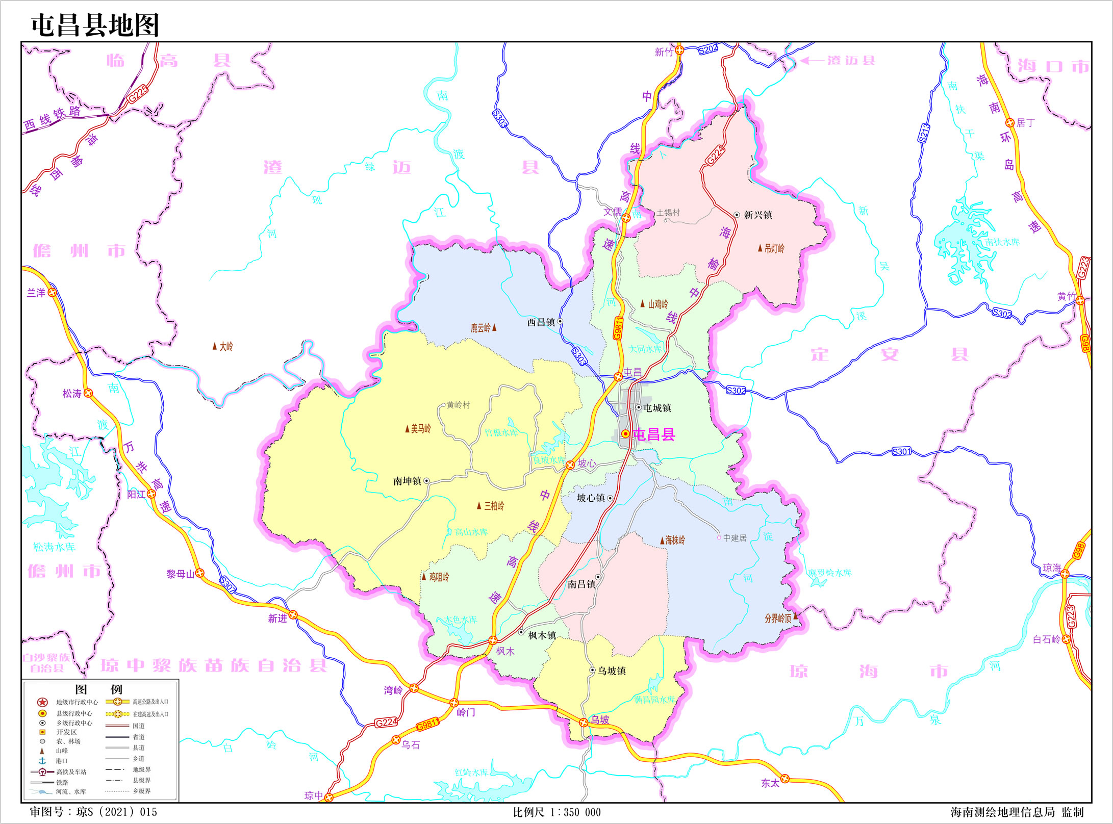 屯昌縣位于海南島中部偏北,地處五指山北麓,南渡江南岸。東與定安縣、瓊海市交界,南與瓊中黎族苗族自治縣接壤,西、北與澄邁縣毗鄰。南北長55千米,東西寬52千米,面積1231.5平方千米。