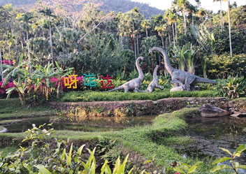 蘭花溪將中國傳統(tǒng)造園技巧與熱帶雨林文化進(jìn)行結(jié)合,附近有花草、茅草屋、徒步小道,長藤下分布有樹桌椅。