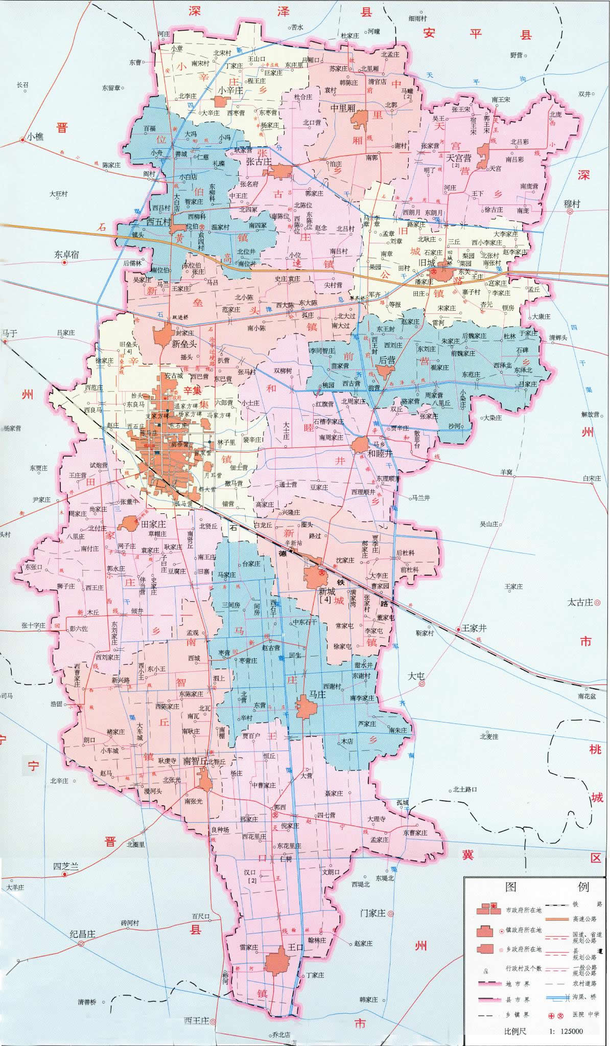 鎮(zhèn):辛集鎮(zhèn)、舊城鎮(zhèn)、張古莊鎮(zhèn)、位伯鎮(zhèn)新壘頭鎮(zhèn)、新城鎮(zhèn)、南智丘鎮(zhèn)、王口鎮(zhèn)
