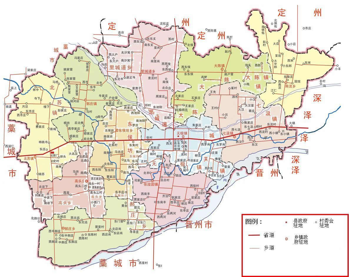 鎮(zhèn):無(wú)極鎮(zhèn)、七汲鎮(zhèn)、張段固鎮(zhèn)、北蘇鎮(zhèn)、郭莊鎮(zhèn)、大陳鎮(zhèn)