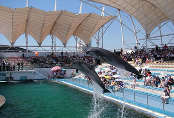 海豚表演館于2000年5月1日正式營業(yè),投資近6000萬元人民幣,占地面積約3000平方米。三面環(huán)座的看臺(tái)可同時(shí)容納2000名游客,站在看臺(tái)極目遠(yuǎn)眺,表演池和大海仿佛融為一體。在優(yōu)美音樂的伴隨下,不僅可以欣賞到海豚的水中華爾茲、空中頂球、跳圈、跨桿、環(huán)場鞠躬跳等高難度的精彩表演;還可以領(lǐng)略海獅投籃、水中霹靂舞、中國功夫等出色的演技;同時(shí)您還有機(jī)會(huì)親身觸摸海豚,與它握手交流,共同感受人與自然默契相通的美好境界。