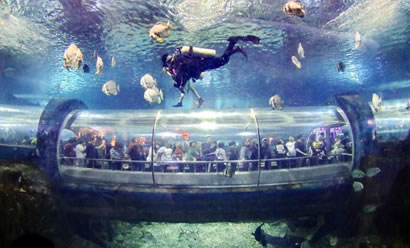 海底世界水族館飼養(yǎng)著來自世界各地的海洋動(dòng)物200多種,共10,000多艉(頭),其中有大量國家一級(jí)、二級(jí)珍稀保護(hù)動(dòng)物,檸檬鯊、豹紋鯊、護(hù)士鯊、海豚、江豚、綠海龜、海獅、海豹、蝠鲼、海狗供游人觀賞。270度環(huán)形的亞克力玻璃圍成的海底隧道全長100米左右,五光十色的珊瑚環(huán)繞在您的周圍,迷人的海底動(dòng)植物盡收眼底。透過窗口還可以看到一個(gè)古羅馬被海水淹沒城市的石像造景。海豚表演館占地面積1萬平方米,建筑面積3,000平方米,總貯水量200萬千克,能同時(shí)容納2000多人同時(shí)觀看表演,以展示生活在海洋中哺乳動(dòng)物的海獸表演為主,是一座具有國際標(biāo)準(zhǔn)的海洋動(dòng)物表演劇場。游客在此可以看到聰明可愛的海豚和滑稽可笑的海獅聯(lián)袂上演精彩紛呈的各項(xiàng)表演:海獅獻(xiàn)上迪斯科、倒立平衡、一獅兩球、套彩圈、單手倒立、頂球過障礙、親吻、水中交誼舞等一系列惟妙惟肖的表演;海豚上演的水中芭蕾舞、踢足球、環(huán)場鞠躬跳躍、伴著樂曲引吭高歌以及充分展示海豚智力的各種表演活動(dòng)。