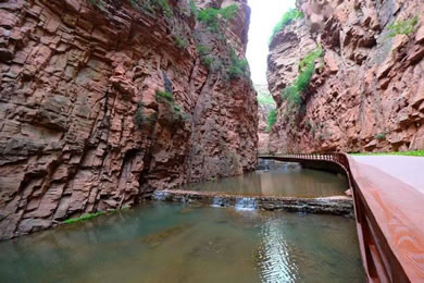 峽長(zhǎng)4000米,一般寬1到2米,最窄處只有十幾厘米,壁高150米,這里紅巖絕壁,險(xiǎn)峰對(duì)峙,黃巢曾在此聚兵起義,抬頭仰望,青天一線,俯視腳下,水流不斷,相隔不遠(yuǎn)便有一道瀑布,溪水清澈見(jiàn)底,清涼透骨。