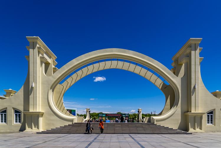 太陽島大門即太陽之門,坐落在太陽島西部主入口處。太陽門全長68米,兩端向太陽石方向環(huán)抱,主門高12.03米。大門為一大四小五個橢圓拱型門相連組成,其造型以新藝術(shù)運動風格的建筑語言為主,并揉以其他風格的藝術(shù)語言,其創(chuàng)意主題為“太陽的窗口”。中間的拱型大門和太陽島巨石在同一中軸線上,行進方向為正東正西,由此可以面向日出日落,四座小拱門中矗立著四座雕塑。門前的巨石,坐落在光輝四射的太陽圖案中心,腳下是模擬的哈爾濱市街區(qū)圖。