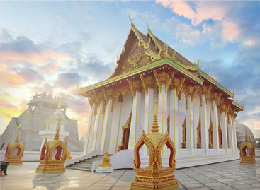 泰國(guó)佛殿苑位于洛陽(yáng)白馬寺古建區(qū)西側(cè),長(zhǎng)寬各108米,有四座苑門,東西南北各一座,其中東門為正門。苑內(nèi)的主要建筑有舍利塔、四面佛、大佛殿、博物館、流通處、鐘鼓樓、涼亭等,建筑錯(cuò)落有致、張弛有度。舍利塔二層供奉有釋迦牟尼佛舍利。泰國(guó)佛殿苑的建成,是中泰兩國(guó)友好和文化交流的見證和象征。