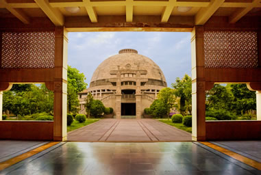 印度佛殿規(guī)劃占地6000平方米,建筑面積為3450平方米。主要建筑包括大佛殿、回廊、牌樓等,布局規(guī)整,別具匠心。大佛殿仿印度著名佛教遺址桑奇大塔建造。大佛殿中央供奉佛祖說法像,表現(xiàn)佛陀在鹿野苑第一次說法——說四圣諦度五比丘的情景。頂部安裝有玻璃天窗,陽(yáng)光從天窗投射下去,照射在佛像周圍。大佛殿上下兩層塔身及殿門前牌坊上雕刻有佛本行故事與佛本生故事。大佛殿底部設(shè)計(jì)有水系。