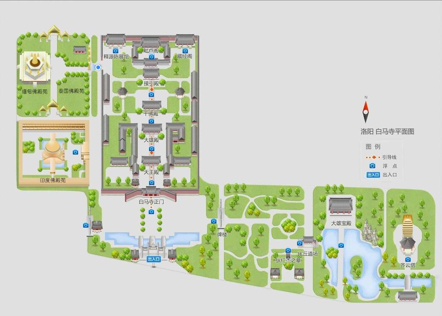 山門——天王殿——大佛殿——大雄寶殿——接引殿——毗盧閣——齊云塔。白塔寺的主建筑物都位于一條中軸線上,游客可以由山門進(jìn)入,依次經(jīng)四大殿,最后到毗盧閣 ,由毗盧閣出門,出門之后可沿途路徑一些新建的展館,雖然不屬于白馬寺主建筑群,但也具有較高的藝術(shù)及文化水準(zhǔn),而齊云塔位于白馬寺東南,不在寺院內(nèi),塔高35米,原是五代后唐李存惠修造的九級(jí)木結(jié)構(gòu)佛塔,藝術(shù)及文化價(jià)值較高。