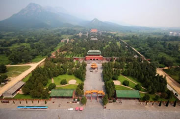 重檐慶殿頂,上覆黃色琉璃瓦,椽飛斗拱,梁枋天花,皆用清代最尊貴的和空彩畫。清初殿外還懸掛有宋人顏體“峻極殿”三字匾。