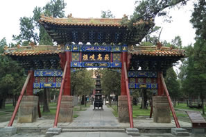峻極殿前筑有3米高的月臺(tái),周圍有石雕欄桿,月臺(tái)正面有三道石階。中間的臺(tái)階分二路,二路間鑲有垂帶式“御路”一石,上面浮雕著精美的圖案,上截為“獨(dú)龍盤踞”,中間為“雙龍戲珠”,下邊為“群鶴鬧蓮”等紋飾。月臺(tái)下面為拜臺(tái),左右為兩座秀麗的御碑亭,兩亭均為重檐八角,東為“御捍亭”,內(nèi)立清乾隆十五年(1750年)的御碑,西為“御帛亭”,內(nèi)立清乾隆四十八年(1783年)的御碑,其字乃草書。