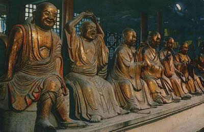 走進羅漢堂,無不被它們的生動形象所感染。只見有的盤腿端坐,有的臥石看天,有的研讀佛經(jīng),有的驅(qū)邪除惡。表情上,有的勇武,有的溫良,有的天真憨厚,有的飽經(jīng)滄桑,個個維妙維肖,活靈活現(xiàn)。如第463尊羅漢是颯陀怒尊者,四周有6個童子,為羅漢挖耳、掩嘴、遮眼等,稱“六賊戲彌勒”。六賊即眼、耳、鼻、舌、身、意。它告誡佛門弟子,不要為凡情所染。塑像中把孩子的天真爛漫,嬌稚頑皮和羅漢的慈祥憨厚的神態(tài)刻化得淋漓盡致,讓人們從心底發(fā)出贊嘆的笑聲。