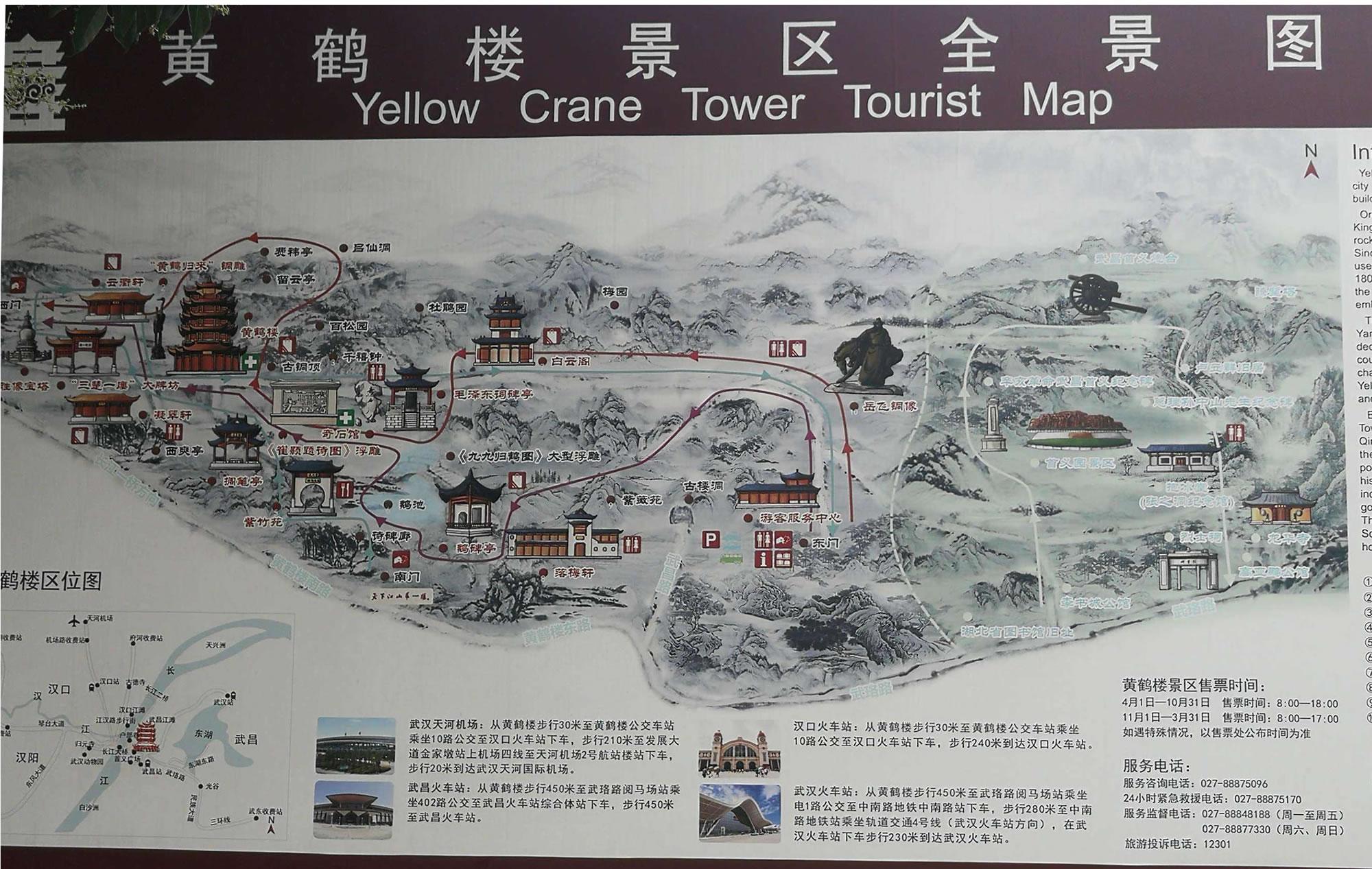 塔、碑廊、山門等建筑。整個建筑具有獨特的民族風(fēng)格。黃鶴樓內(nèi)部,層層風(fēng)格不相同。底層為一高大寬敞的大廳,其正中藻井高達(dá)10多米,正面壁上為一幅巨大的“白云黃鶴”陶瓷壁畫,兩旁立柱上懸掛著長達(dá)7米的楹聯(lián):爽氣西來,云霧掃開天地撼;大江東去,波濤洗凈古今愁。二樓大廳正面墻上,有用大理石鐫刻的唐代閻伯瑾撰寫的《黃鶴樓記》,它記述了黃鶴樓興廢沿革和名人軼事;樓記兩側(cè)為兩幅壁畫,一幅是“孫權(quán)筑城”,形象地說明黃鶴樓和武昌城相繼誕生的歷史;另一幅是“周瑜設(shè)宴”,反映三國名人去黃鶴樓的活動。三樓大廳的壁畫為唐宋名人的“繡像畫”,如崔顥、李白、白居易等,也摘錄了他們吟詠黃鶴樓的名句。四樓大廳用屏風(fēng)分割幾個小廳,內(nèi)置當(dāng)代名人字畫,供游客欣賞、選購。頂層大廳有《長江萬里圖》等長卷、壁畫!
