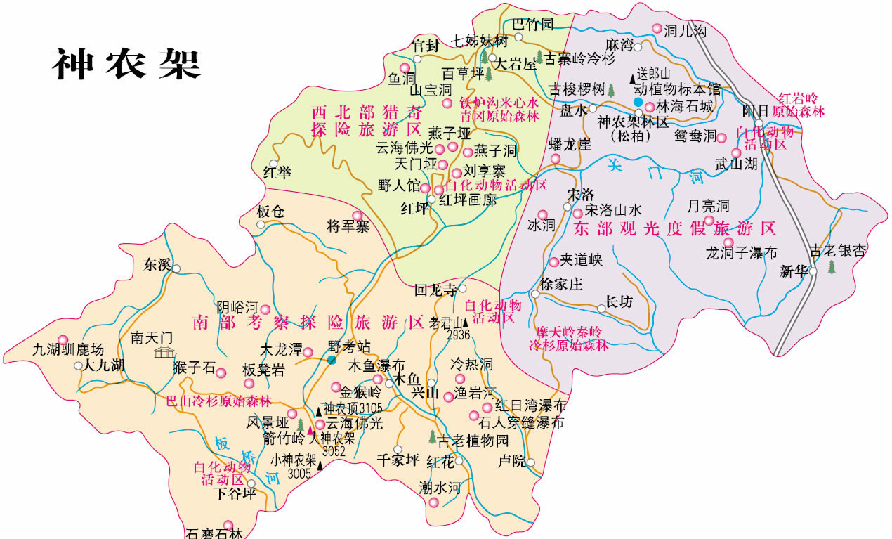 神農(nóng)架是我國內(nèi)陸保存完好的唯一一片綠洲和世界中緯度地區(qū)唯一的一塊綠色寶地。它所擁有的在當(dāng)今世界中緯度地區(qū)唯一保持完好的亞熱帶森林生態(tài)系統(tǒng),是最富特色的壟斷性的世界級旅游資源,動植物區(qū)系成分豐富多彩,古老、特有而且珍稀。蒼勁挺拔的冷杉、古樸郁香的巖柏、雍容華貴的梭羅、風(fēng)度翩翩的珙桐、獨(dú)占一方的鐵堅杉,枝繁葉茂,遮天蔽日;金絲猴、白熊、蘇門羚、大鯢以及白鸛、白鶴、金雕等走獸飛禽出沒草叢,翔天林間。一切是那樣地和諧寧靜,自在安詳。這里還有著優(yōu)美而古老的傳說和古樸而神秘的民風(fēng)民俗,人與自然其同構(gòu)成我國內(nèi)地的高山原始生態(tài)文化圈。神農(nóng)氏嘗草采藥的傳說、“野人”之謎、漢民族神話史詩《黑暗傳》、川鄂古鹽道、土家婚俗、山鄉(xiāng)情韻都具有令人神往的誘惑力。這里山峰瑰麗,清泉甘冽,風(fēng)景絕妙。神農(nóng)頂雄踞“華中第一峰”,風(fēng)景埡名躋“神農(nóng)第一景”;紅坪峽谷、關(guān)門河峽谷、夾道河峽谷、野馬河峽谷雄偉壯觀;陰峪河、沿渡河、香溪河、大九湖風(fēng)光綺麗;萬燕棲息的燕子洞、時冷時熱的冷熱洞、盛夏冰封的冰洞、一天三潮的潮水洞、雷響出魚的錢魚洞令人叫絕;流泉飛瀑、云海佛光皆為大觀!