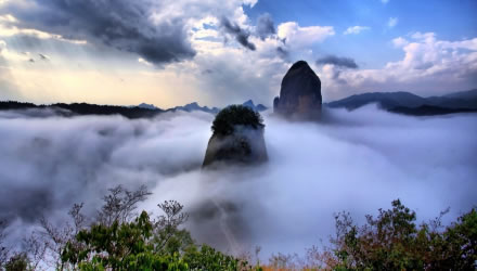 武岡云山,云山,湘西南名山,屬雪峰山余脈,以云多奇幻而得名。位于武岡市城南5千米處,東西綿延數(shù)十里,毗連著武岡、新寧、城步三縣疆界。最高峰海拔1372.5米,為國家級森林公園和國家3A景區(qū)。分伴山?jīng)_、云山堂、紫霄峰幾大景區(qū),景區(qū)中云海、古樹、流泉、溪澗、瀑布、幽谷、山峰、怪石、古剎、靈寺、古道、古跡一應(yīng)俱全,被譽(yù)為"楚南勝地"。始建于三國吳國時(shí)勝力寺,寺廟面積2500平方米,寺內(nèi)有彌勒殿、大雄寶殿、觀音殿等,建筑完好,為湘西南著名的宗教文化活動(dòng)場所和游覽勝地。1982年被列為國家自然保護(hù)區(qū),1992年9月經(jīng)原國家林業(yè)部批準(zhǔn)建立國家級森林公園。