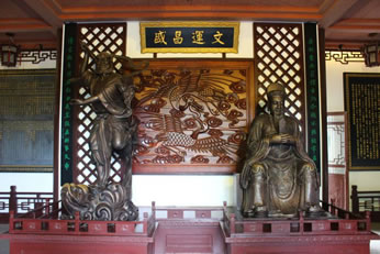 在這兩尊神像的兩邊石柱牌匾上刻有曾國(guó)藩題寫(xiě)的對(duì)聯(lián):上聯(lián)是“垂訓(xùn)意無(wú)窮,爍古炳今,總不外綱常名教”;下聯(lián)是:“讀書(shū)期有用,居仁由義,豈徒在科第文章”。從曾國(guó)藩的這幅對(duì)聯(lián)可以看出,在當(dāng)時(shí)歷史環(huán)境下,不經(jīng)過(guò)科舉,士子們是不可能獲得一官半職和有所作為的;而要獲取功名,還得靠自己讀書(shū)的刻苦和對(duì)綱常名教的執(zhí)著。上方題有“文運(yùn)昌盛”四字牌匾,預(yù)示著湖南人杰地靈,文運(yùn)昌盛,更是人才輩出的地方。展示廳右邊墻面青石板上刻有“歷代湖南狀元名錄”,左邊刻有“歷代長(zhǎng)沙進(jìn)士名錄”和“明清長(zhǎng)沙府著名科舉人才名錄”,細(xì)心的游客朋友都會(huì)發(fā)現(xiàn),湖南歷朝歷代金榜題名考中狀元者只有15人,而考中進(jìn)士之人達(dá)1300人以上,同時(shí),位居顯赫,大有作為之人均在進(jìn)士之中!