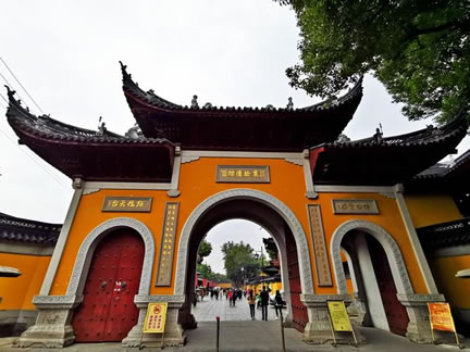 寒山寺殿宇大多為清代建筑,主要有大雄寶殿、藏經(jīng)樓、鐘樓、碑廊、楓江樓、霜鐘閣等。寒山寺的建筑布局沒有嚴(yán)格的中軸線。寒山寺山門前面的石拱圈古橋是江村橋,橋堍與山門之間那垛黃墻稱照壁。山門兩旁兩棵古樟。黃墻內(nèi)古典樓閣飛檐翹角,右為楓江樓,左為霜鐘樓,都源于楓橋夜泊詩。佛龕背后一尊威風(fēng)凜凜的將軍像,面朝里,對(duì)著大雄寶殿,手拿金剛杵,也叫降魔杵,那是韋馱,位居四大天王手下的三十二神將之首。